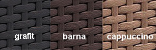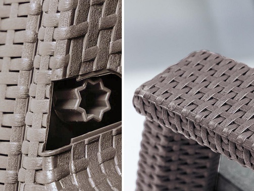 A bemutatott készlet megvalósítása - polyrattan utánzása. A bútorok anyaga tökéletesen utánozza a polirattant - valójában nehéz megkülönböztetni a valódi fonattól. A polipropilén mellett a gyárilag préselt polipropilén időjárásálló. Az erős napsütésben is védett a fakulás ellen, köszönhetően annak, hogy a polipropilén ellenáll az UV sugárzásnak . Ebből az anyagból készült bútorokat szintén nagyon könnyű tisztán tartani. Kis mennyiségű mosószer vagy akár nedves ruha is elegendő a makacs foltok megszabadításához.