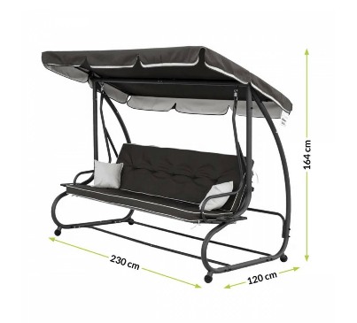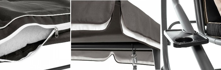 A hinta karfákkal rendelkezik, ami jelentősen növeli az ülés kényelmét. A készlet tartalmazza a párnákat az ülésen, és a fejtámlán, valamint díszpárnákat is. A tetővel ellátott kerti hintában italtartók találhatók, amelyek tökéletesek a közös szabadban történő pihenéshez. Előnye az állítható dőlésszögű napellenző, mely véd az erős napsugaraktól, vagy a nyári esőtől. A kerti hinták tökéletesek mind a kertben, mind a teraszon, lehetővé téve a pihenést, miközben finoman hintáznak.