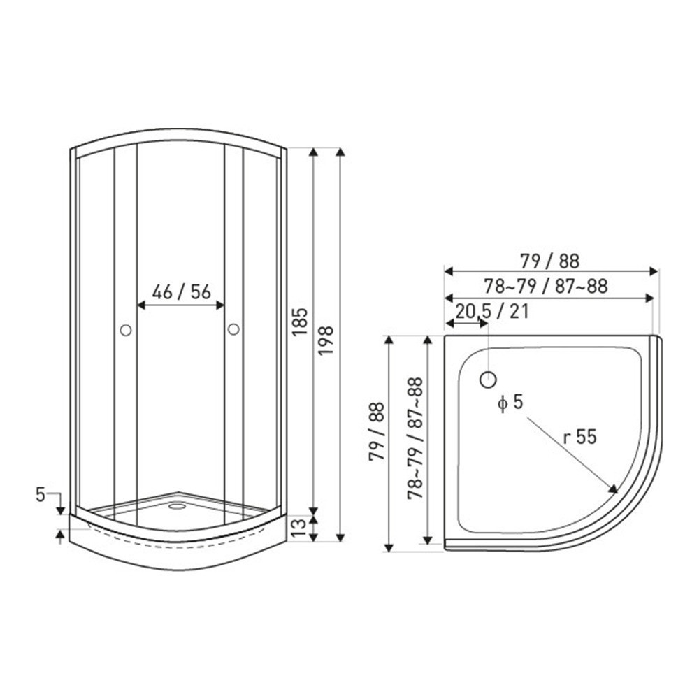 A zuhanykabin 4 mm-es edzett üvegből készült és biztonsági üveggel van ellátva. A zuhanykabin íves kivitelben kapható. Dupla görgős ajtókkal van ellátva. A kabin 80x80x185 cm méretű (teljes magassága tálcával: 198 cm). A fehér akril zuhanytálca méretei 79x79x13 cm!