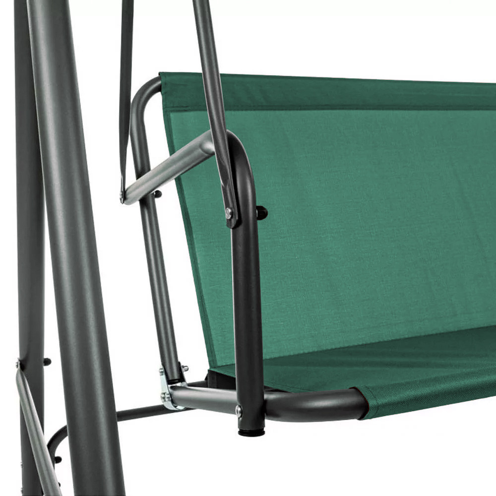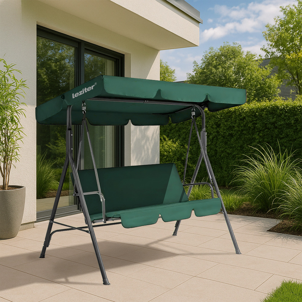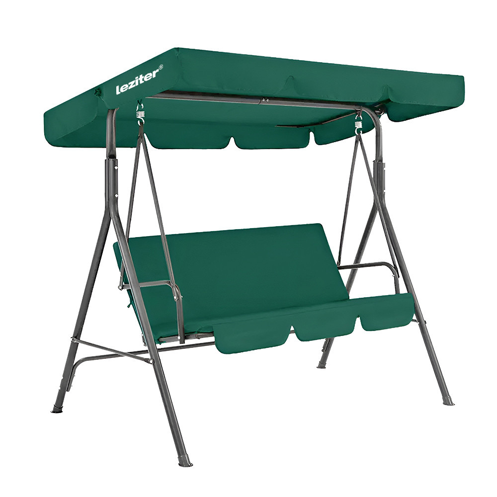 A poliészter tető nem csak a nap káros UV-sugárzása ellen nyújt védelmet, hanem egy kis menedéket is biztosít az enyhébb esőzések során. Az anyaga ellenáll a napfény okozta kifakulásnak, így a hintaágy színe hosszú ideig megőrzi eredeti zöld árnyalatát.